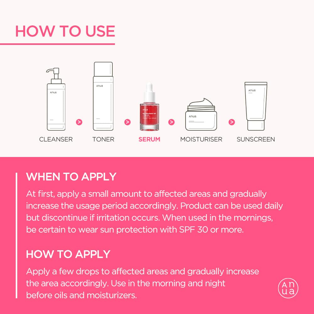 After toner, apply 2-3 drops onto the skin and gently pat until absorbed. Make sure to apply sunscreen after when used in the morning.