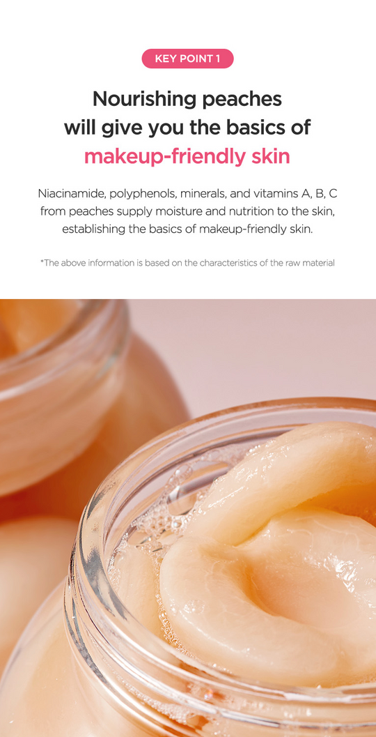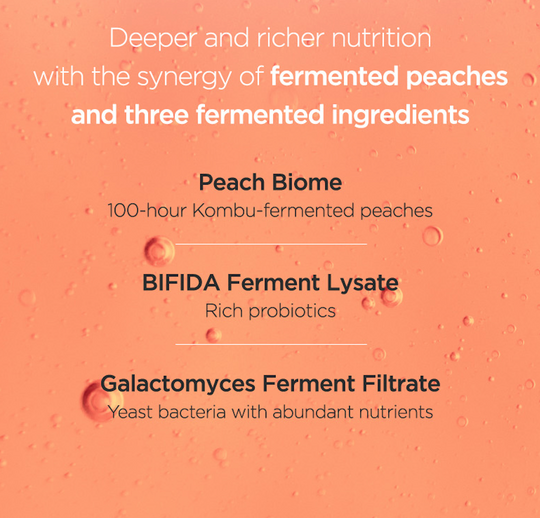 Prunus Persica (Peach) Fruit Extract (77%), Glycerin, Ethylhexyl Stearate, Dipropylene Glycol, Niacinamide (2%), Methyl Trimethicone, 1,2-Hexanediol, Lactobacillus Ferment, Polyglyceryl-3 Distearate, Cetearyl Alcohol, Hydrogenated Poly(C6-12 Olefin), Prunus Persica (Peach) Flower Extract, Sodium Hyaluronate, Glyceryl Stearates, Sodium Stearoyl Glutamate, Carbomer, Galactomyces Ferment Filtrate, Bifida Ferment Lysate, Water, Arginine, Glyceryl Stearate Citrate, Disodium EDTA, Adenosine, Methylpropanediol, Betaine Salicylate, Panthenol, Cyanocobalamin, Ceramide NP, Saccharomyces Ferment Filtrate, Hydrolyzed Hyaluronic Acid, Sodium Acetylated Hyaluronate, Fragrance, Hydroxyacetophenone, Ethylhexylglycerin