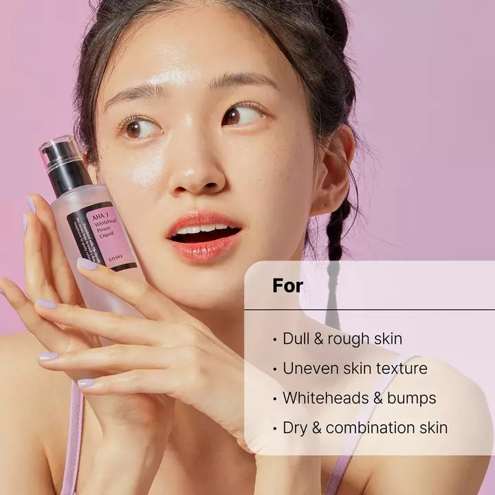 Get clear, glowing, whitehead-free skin! COSRX AHA 7 Whitehead Power Liquid is a clarifying treatment that targets congested pores and keeps skin clear with exfoliating alpha hydroxy acids like glycolic acid. Formulated with 7% Glycolic Acid (AHA), the toner gently exfoliates skin and helps reveal a radiant, even-toned complexion.