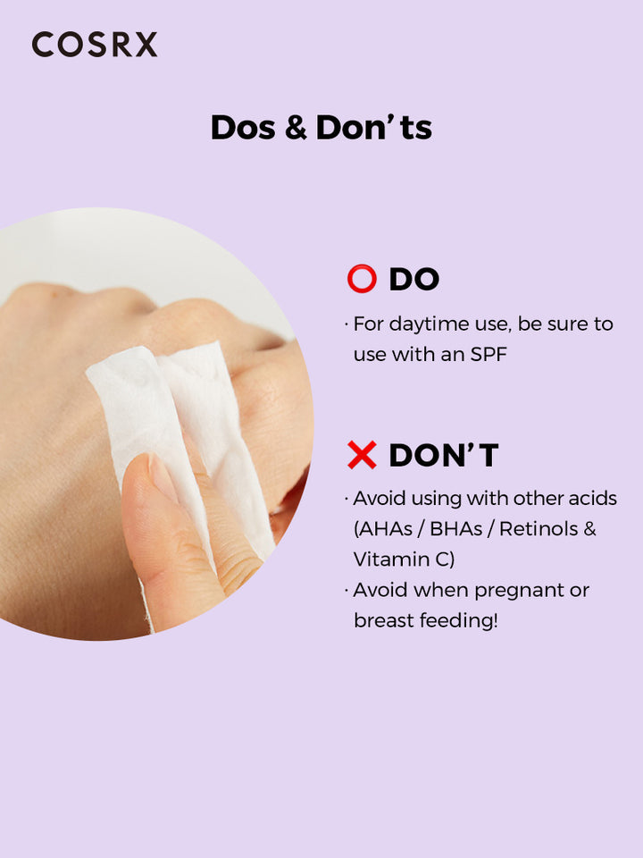 * Avoid using with other acids (AHAs / BHAs / Retinols & Vitamin C)