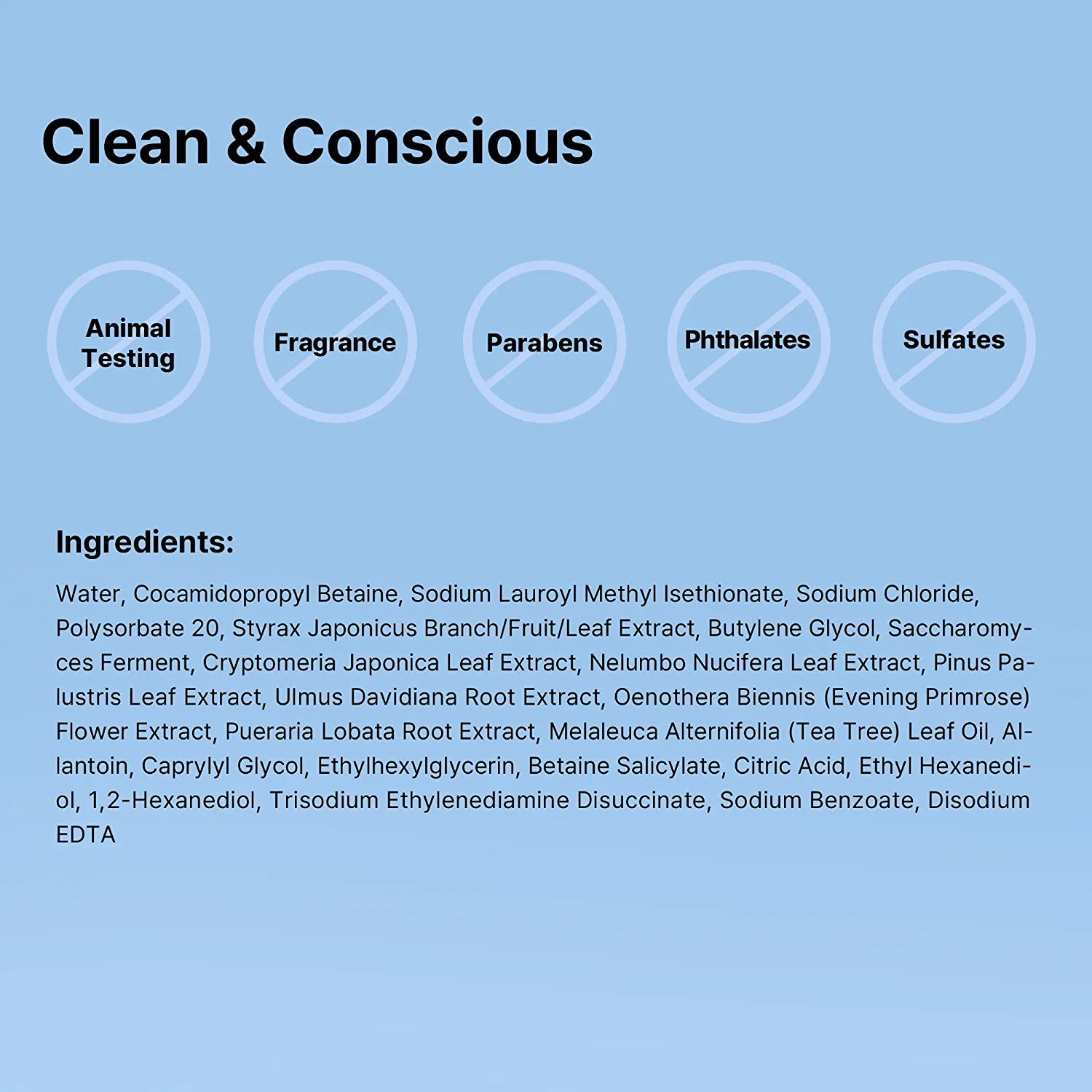 Ingredients : Water, Cocamidopropyl Betaine, Sodium Lauroyl Methyl Isethionate, Sodium Chloride, Polysorbate 20, Styrax Japonicus Branch/Fruit/Leaf Extract, Butylene Glycol, Saccharomyces Ferment, Cryptomeria Japonica Leaf Extract, Nelumbo Nucifera Leaf Extract, Pinus Palustris Leaf Extract, Ulmus Davidiana Root Extract, Oenothera Biennis (Evening Primrose) Flower Extract, Pueraria Lobata Root Extract, Melaleuca Alternifolia (Tea Tree) Leaf Oil, Allantoin, Caprylyl Glycol, Ethylhexylglycerin, Betaine Salicylate, Citric Acid, Ethyl Hexanediol, 1,2-Hexanediol, Trisodium Ethylenediamine Disuccinate, Sodium Benzoate, Disodium EDTA